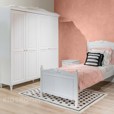 Lora prinsessen thema meisjeskamer, massief hout brocante afwerking met o.a. een hemelbed of twijfelaarbed en 3-deur of 4-deurskasten met LED verlichting.