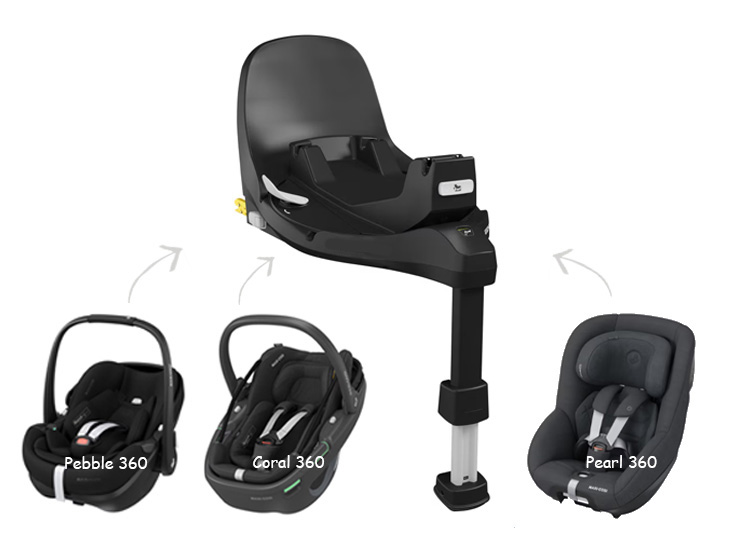 De FamilyFix 360-base...  Dit nieuwe roterende autostoelsysteem, bestaat uit een roterende  en de bijbehorende Pebble 360 en Pearl 360 autostoeltjes, om je baby vanaf de geboorte tot 4 jaar in te vervoeren! De Maxi-Cosi FamilyFix 360-base is zo gemaakt dat je de Maxi-Cosi Pebble 360, Maxi-Cosi Pearl 360 en onze Maxi-Cosi Coral 360 er snel en makkelijk op vastzet. En je kunt het allemaal doen zonder voorover te buigen en je rug te belasten. Na het installeren, kunt je de Maxi-Cosi FamilyFix 360 in de auto laten en de Maxi-Cosi-autostoeltjes met Click & Go eenvoudig vastklikken. Dankzij de 360-rotatiehendel van de base kan een 360°-autostoeltje soepel en gemakkelijk met één hand worden gedraaid, perfect voor drukke ouders die hun handen vol hebben. FlexiSpin-technologie zorgt ervoor dat de base in elke ligstand kan roteren.