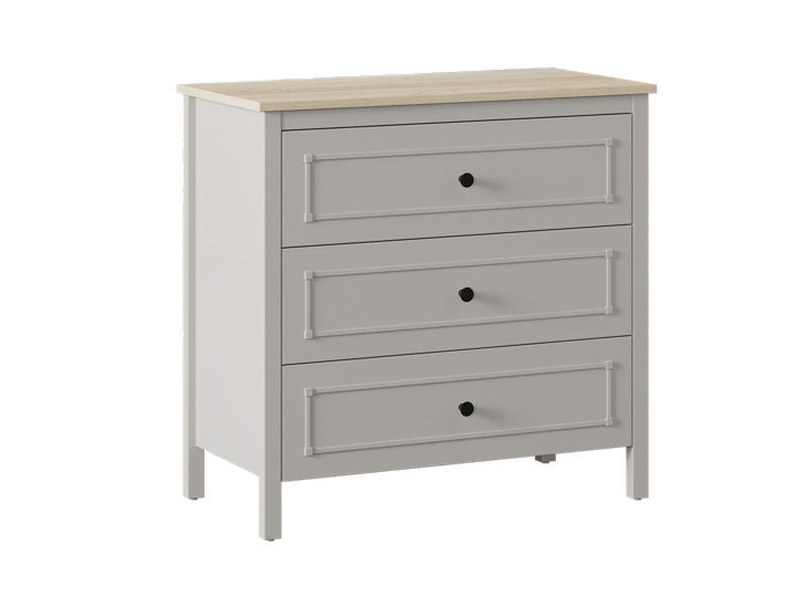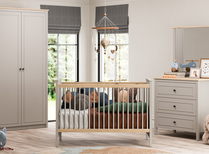 De Sento 3-delige meegroeikamer van Almila, bestaande uit een meegroei ledikant 70x140, een commode met 3 lades en een 2-Deurskast met 6 legplanken en twee kledingroedes. Deze babykamer heeft een moderne grijze afwerking en subtiele eiken accenten.