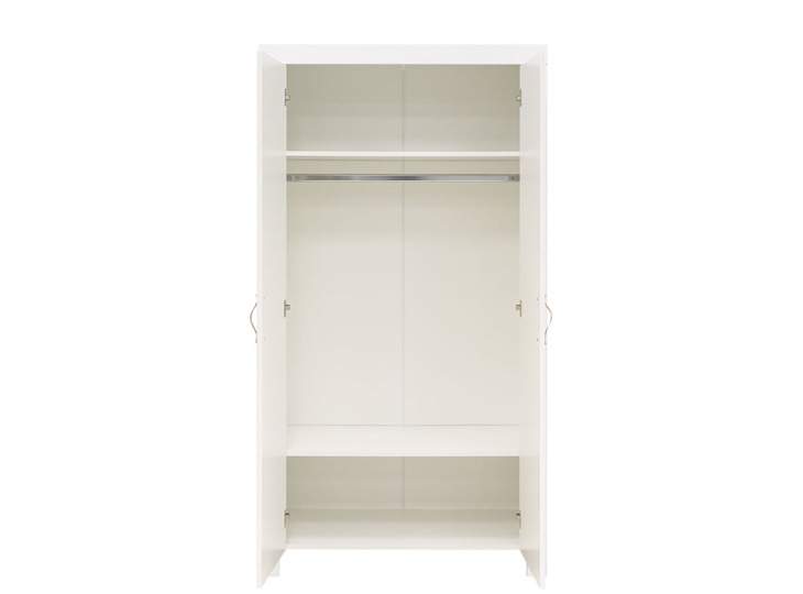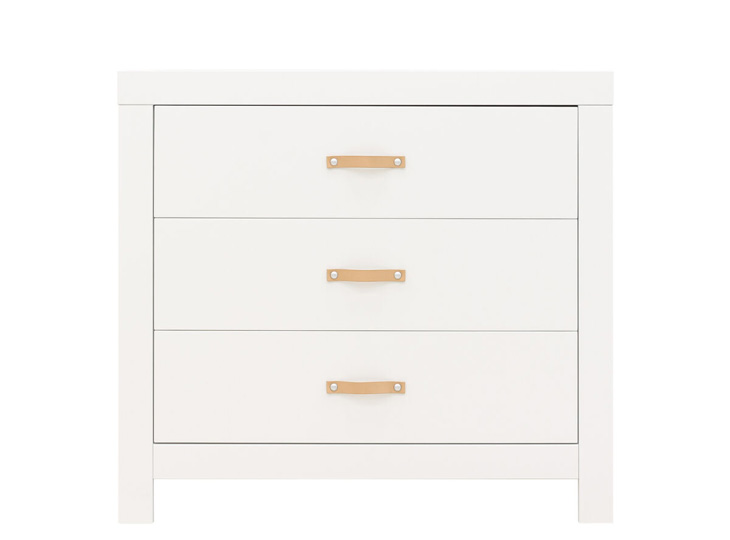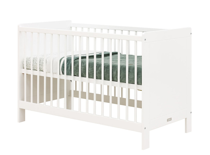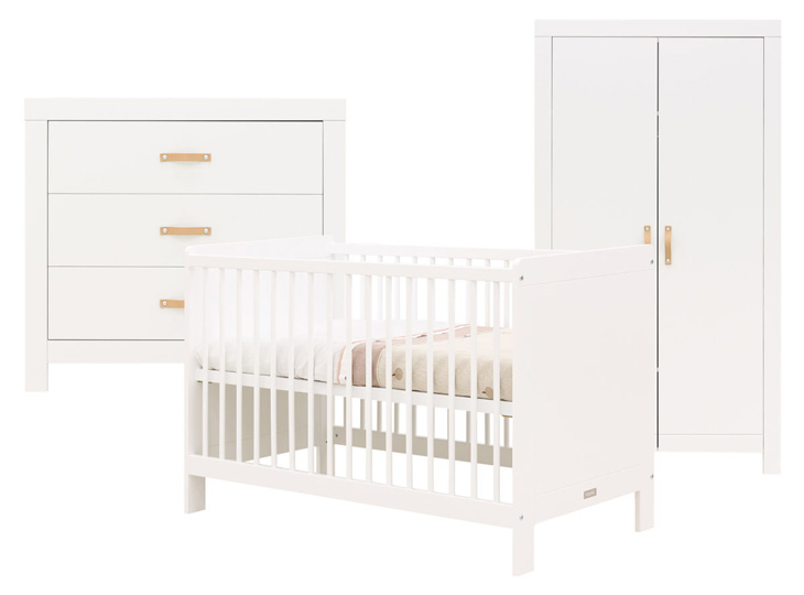 Bopita Senn 4-Delige babykamer, bestaande uit een Ledikant 60 x 120 cm, een commode met 3 laden,  een 2-deurskast en een wandschap. Vervaardigd uit hoogwaardig MDF-materiaal in een elegante witte afwerking. De bodem van het bed is in hoogte verstelbaar. Zodra het kind groter wordt, of zichzelf kan optrekken aan de spijlen, kan je de bodem verlagen. Zo blijft het bed een veilige plek.