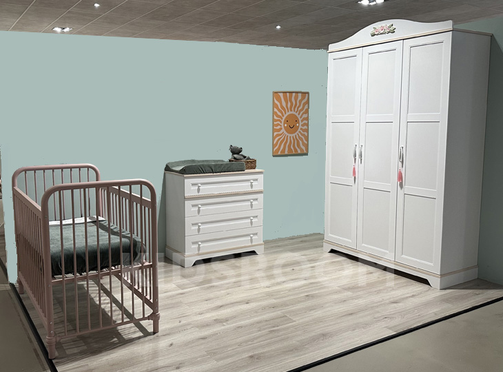 3-Delige babykamer! Compleet met ledikant, commode en 3-Deurskast. Het Bronxx babybed is gemaakt van duurzaam metaal en voorzien van een matte lak. Het babybed heeft een standaard afmeting van 60x120 en is in de hoogte verstelbaar. Dit babybed komt in de trendy kleur misty pink. De commode past in iedere meisjeskamer en geeft extra sfeer. Er is genoeg opbergruimte dankzij de 4 royale lades. De bovenste lade bestaat uit één lade, maar deze is opgedeeld in 3 vakken. Super handig om bijvoorbeeld luiers en hemdjes georganiseerd in op te bergen! De 3-Deurs kledingkast is ontworpen met elegante ronde vormen en verfijnde bloemendetails die de kast sieren. Met deze kast krijgt de babykamer in één keer een warme en gezellige uitstraling! Achter de linker- en middendeur 2 legplanken en 2 kledingroedes. Achter de rechterdeur 5 legplanken. Hierdoor dus genoeg opbergruimte! De kledingroedes zijn voorzien van ledverlichting. De kledingkast en commode zijn gemaakt van hoogwaardig plaatmateriaal met een melamine afwerking in het wit.