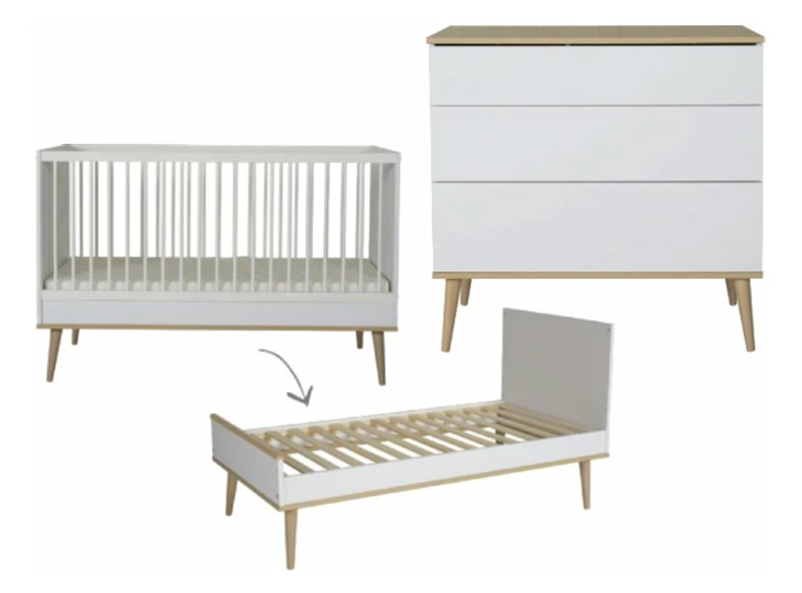 De Quax Flow 2-delige meegroeikamer in de kleur White&Oak heeft een prachtige uitstraling. De egale lak combineert met hout fineer staat zeer luxe. De set bestaat uit een meegroeibedje(70×140) en een commode. Zo kan je baby slapen, kun je verschonen en heb je genoeg opbergruimte. Het ledikant is later om te bouwen tot peuterbedje. Mocht je meer ruimte nodig hebben kun je ook voor de 3-delige set gaan. Hier zit een kledingkast bij. In de Flow collectie van Quax is ook een bladvergroter (Barrier) beschikbaar zodat je meer ruimte hebt tijdens het verschonen en je baby recht voor je ligt. Dit maakt het een stuk gemakkelijker. Deze is los bij te bestellen net als een passend matrasje.