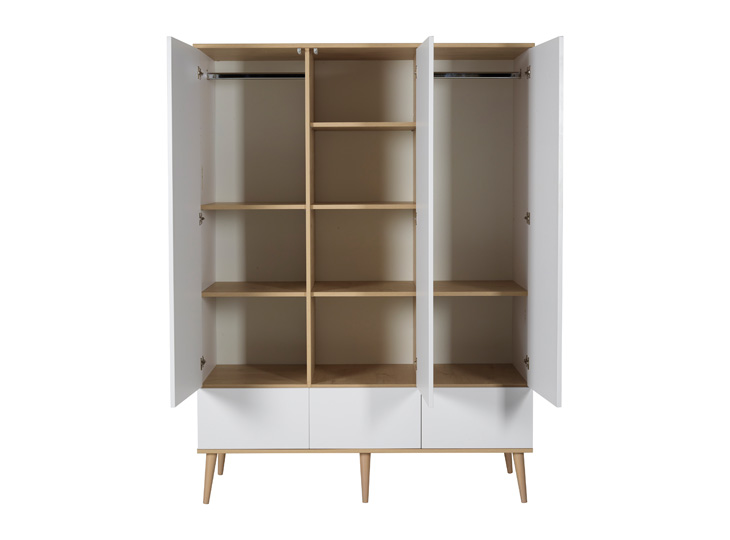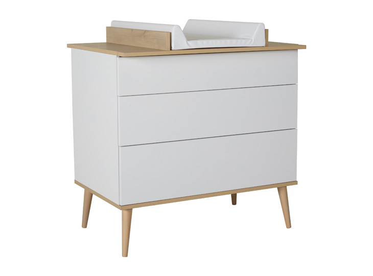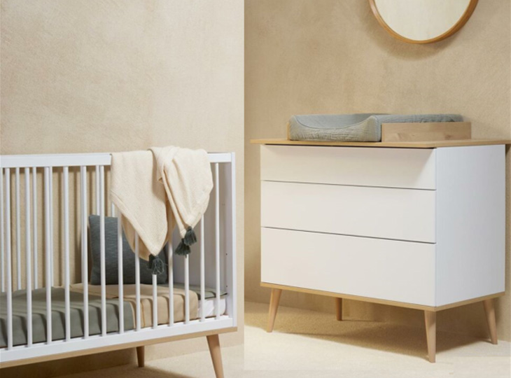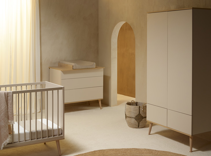 De babykamer van de serie Flow White & Oak kenmerkt zich door de witte kleur en beukenhouten pootjes. De kamer heeft hierdoor een rustige, warme en natuurlijke uitstraling. De commode en kasten zijn greeploos en zijn voorzien van een push-open systemen, dit maakt deze babykamer kindvriendelijk en stil. Het ledikant heeft een blank houten onderstel van massief beukenhout net als de voetjes van de commode. De serie is ook te bestellen als 3-delige babykamer en als meegroeikamer.