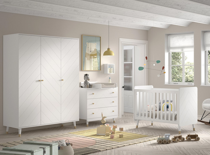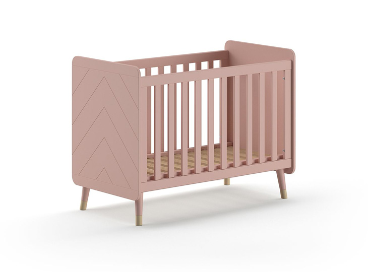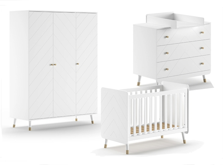 4-Delige babykamer Billy van Vipack. De diagonale groeven in deze meubelen zorgen samen met de schuine, goudkleurige pootjes en afgeronde hoeken voor een hippe uitstraling. De meubelen zijn gemaakt van hoogwaardig MDF. De commode met bijbehorende barrier (optioneel)  biedt voldoende ruimte om alle benodigdheden bij het verschonen van je baby binnen handbereik te houden. Met de 3-deurskast berg je kleding, beddengoed en speelgoed makkelijk op. En heerlijk wegdromen doe je in het ledikantje. Toch liever het ledikantje in een andere kleur? dit kan ook! Bekijk de foto's voor de kleuren Terra Pink en Olive green