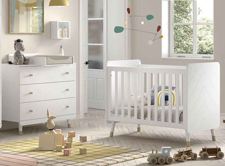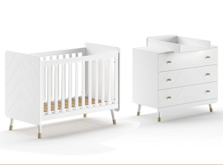 3-Delige babykamer Billy van Vipack. De diagonale groeven in deze meubelen zorgen samen met de schuine, goudkleurige pootjes en afgeronde hoeken voor een hippe uitstraling. De meubelen zijn gemaakt van hoogwaardig MDF. De commode met bijbehorende barrier biedt voldoende ruimte om alle benodigdheden bij het verschonen van je baby binnen handbereik te houden. En heerlijk wegdromen doe je in het ledikantje. Toch liever het ledikantje in een andere kleur? dit kan ook! Bekijk de foto's voor de kleuren Terra Pink en Olive green