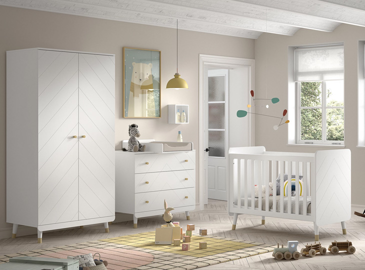 4-Delige babykamer Billy van Vipack. De diagonale groeven in deze meubelen zorgen samen met de schuine, goudkleurige pootjes en afgeronde hoeken voor een hippe uitstraling. De meubelen zijn gemaakt van hoogwaardig MDF. De commode met bijbehorende barrier biedt voldoende ruimte om alle benodigdheden bij het verschonen van je baby binnen handbereik te houden. Met de tweedeurkast berg je kleding, beddengoed en speelgoed makkelijk op. En heerlijk wegdromen doe je in het ledikantje.