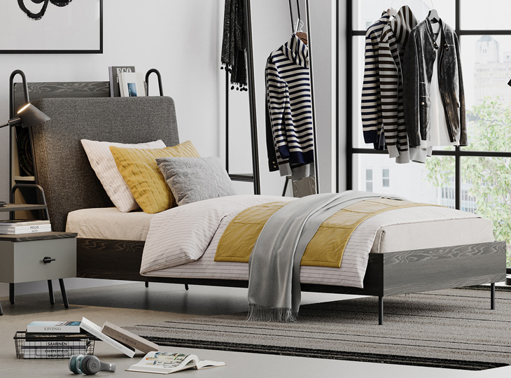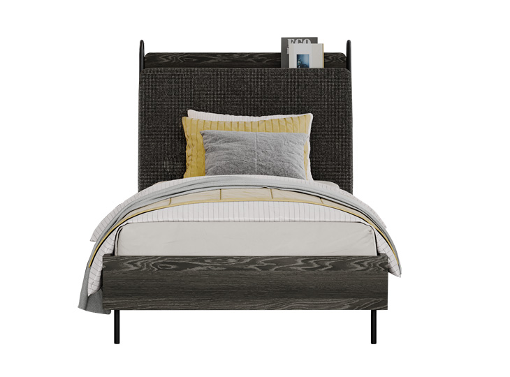 Het twinbed 120x200 uit de serie Arwen is voorzien van een gestoffeerd hoofdbord in de kleur antraciet met daarachter een boekenvak. Het boekenvak kan rechts of links gemonteerd worden, net wat jezelf mooi vindt. Als je beide zijde niet wil kan het ook in het vak achter het hoofdbord weggewerkt worden. De zijdes van het bed zijn zwart met een eikenlook. Ledikant Arwen is gemaakt van hoogwaardig meubelspaanplaat met een melamine afwerking in eiken structuur. Het bed staat op metalen pootjes. Van de Arwen serie is er ook een kinderkamer beschikbaar.
