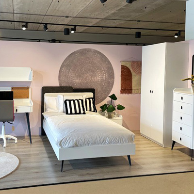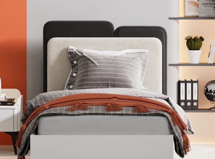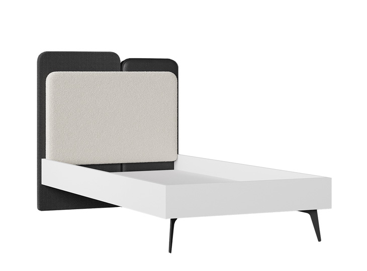 Het ledikant 90x200 uit de serie Vena is voorzien van een wit gestoffeerd hoofdbord met een teddylook met daarachter een zwart leerlook hoofdbord en een zwart linnenlook hoofdbord. De bedzijdes zijn wit en het bed staat op zwarte metalen pootjes.