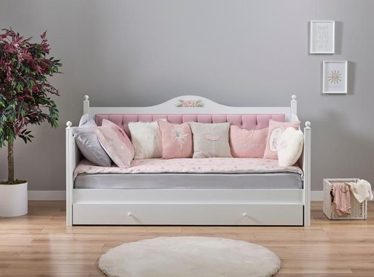 De bedbank met slaap/opberglade is zonder lattenbodem en matras. De sier kussens zijn los bij te bestellen.