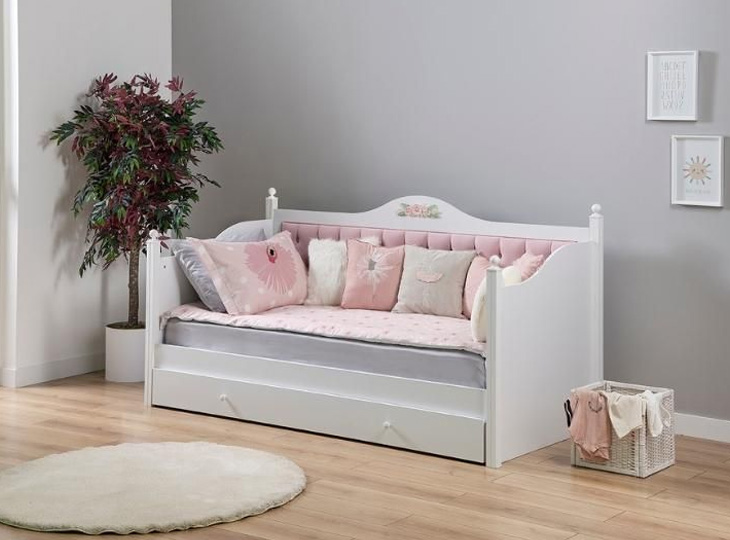 De Bianca bedbank heeft een landelijk wit design en maakt zich extra bijzonder door de prachtige bloemen die zijn afgebeeld op de bedbank. De bedbank is voorzien van een gestoffeerd roze paneel.