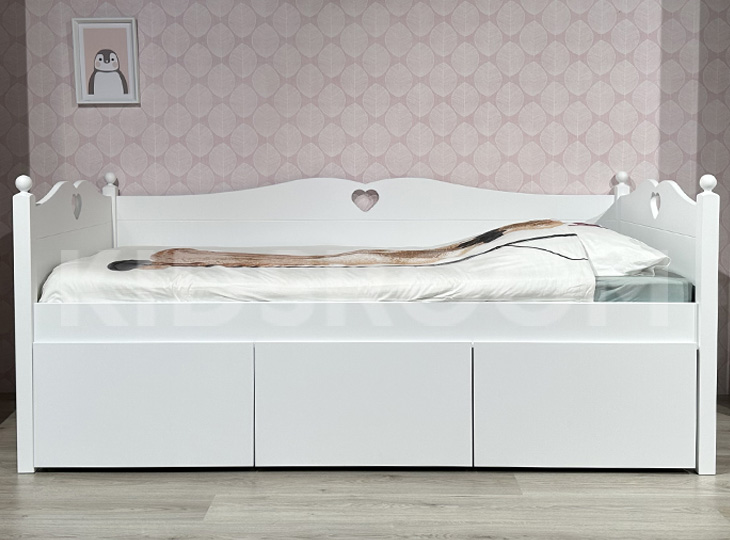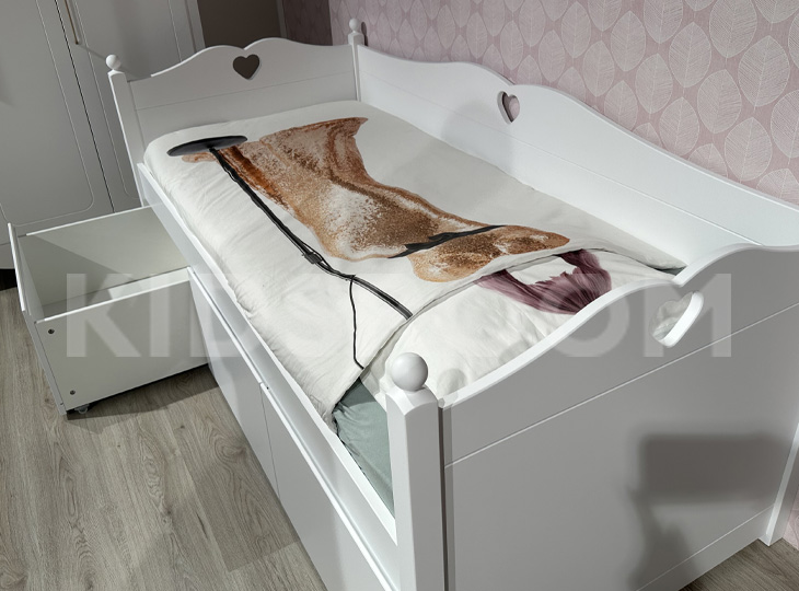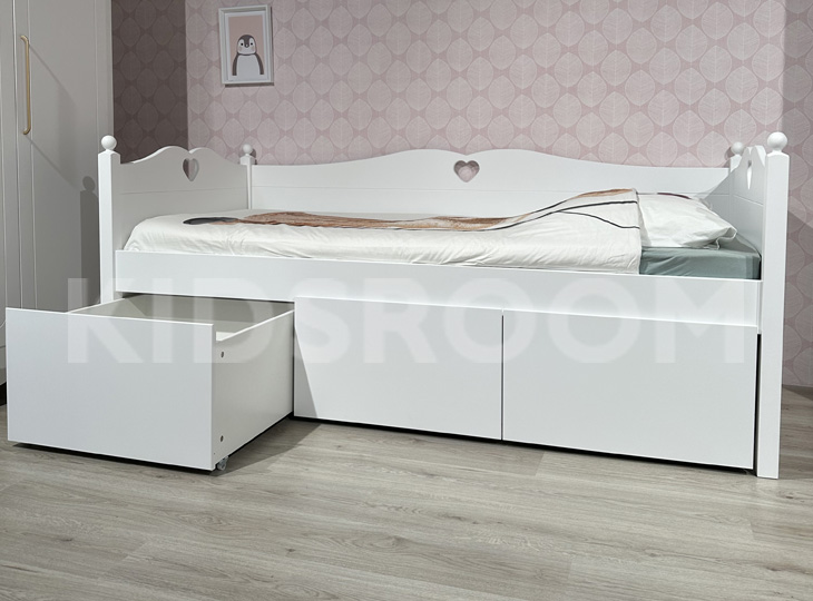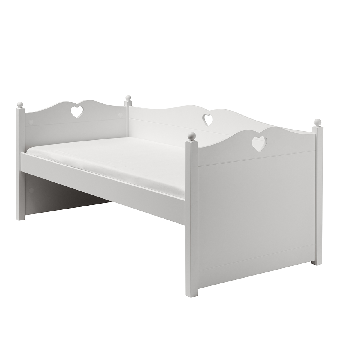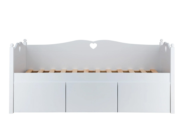De Emma Bedbank is een prachtige toevoeging aan elke romantische meisjeskamer. Het sierlijke ontwerp en de strakke witte afwerking zorgen voor een tijdloze uitstraling. Berg het speelgoed op in de ruime bakken op wieltjes en geniet van een nette kinderkamer. De sierlijke afwerking en de gefreesde hartjes maken dit meisjesbed helemaal af.
