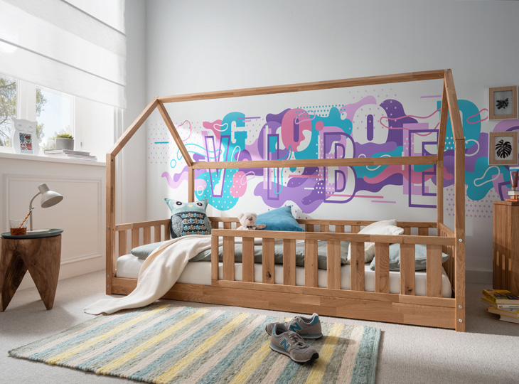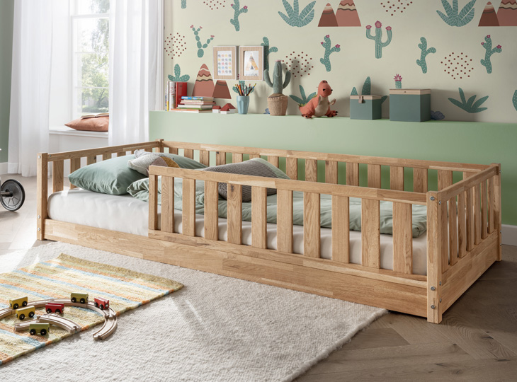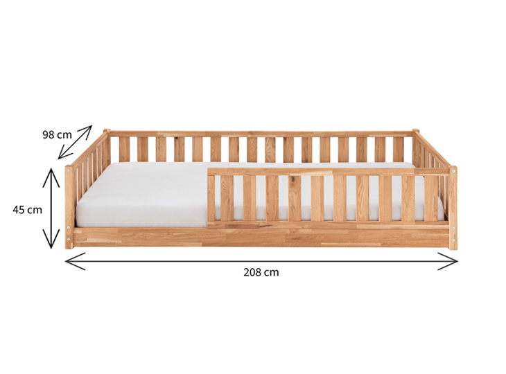 Het Fenna bodembed (ook wel vloerbed of Montessori-bed) is de ideale keuze voor peuters en jonge kinderen. Dankzij de balustrades slaapt je kleintje veilig zonder uit bed te rollen, terwijl de lage instap het mogelijk maakt om zelfstandig in en uit bed te stappen.