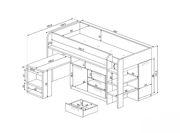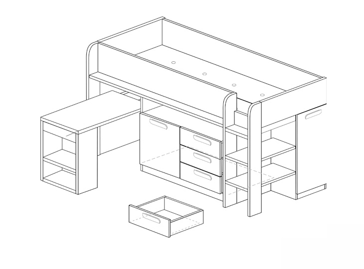 Aan de rechterzijde een robuuste en veilige trap met erachter boekenplankjes en een bergkast. Met een handig uitschuifbaar bureau met opbergvakken voor boeken etc. Daartussen een open vak met eronder een bergkast met deur en een ladekast met 3 op metalen rolgeleiders schuivende laden. Op een bescheiden oppervlakte een bed met héél veel bergruimte, ideaal voor de kinder of tienerkamer.