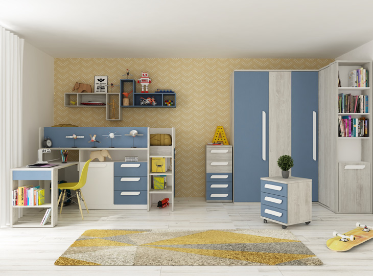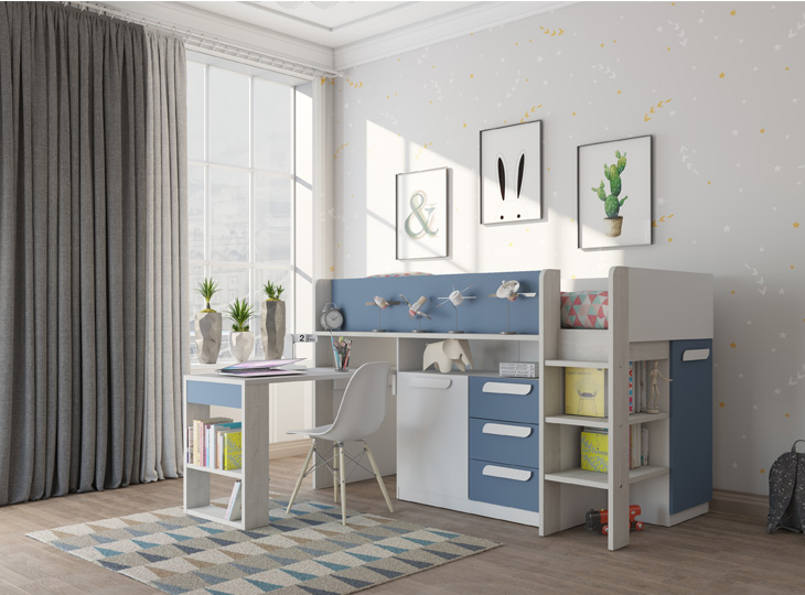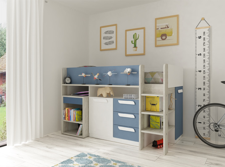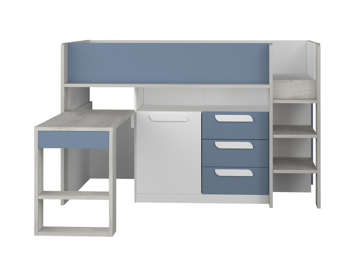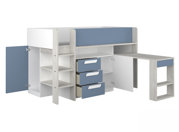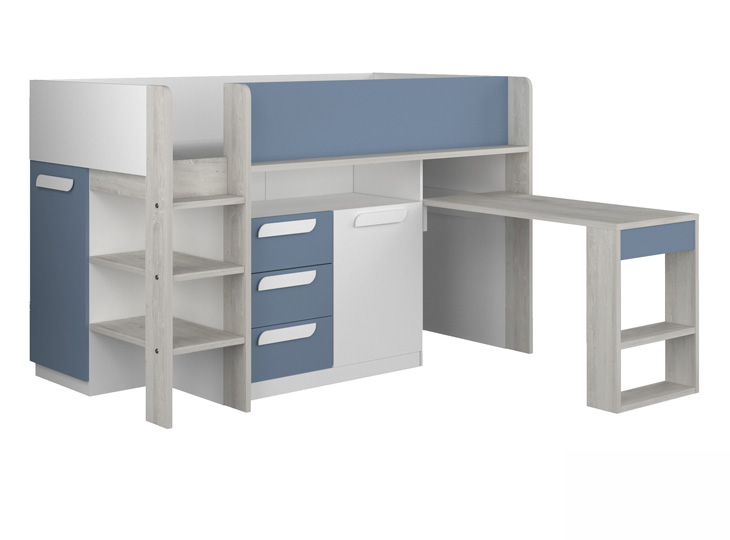 Halfhoogslaper Yolo stevig modern en gemaakt van hoogwaardig plaatmateriaal met een melamine afwerking. Dit in een combinatie van witgrenen kleur en Blauw.