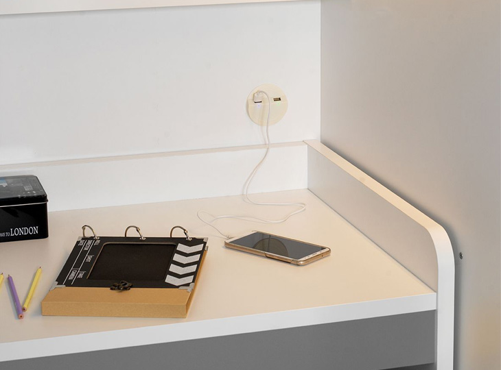 Met de Neo grijs/wit hoogslaper met trapkast en bureau is je slaapkamer in één keer een stuk completer! Je kan niet alleen slapen, maar ook studeren met deze meubels! Verder beschikt de hoogslaper ook nog eens over opbergruimte, wat handig! Zowel de hoogslaper als het bureau zijn vervaardigd uit plaathout met melamine folie afwerking van zeer goede kwaliteit. De vormen van de meubels zijn strak en geven ze een moderne uitstraling. Deze hoogslaper op zichzelf is super veelzijdig. De trap functioneert niet alleen als trap maar ook als extra opbergruimte dankzij de vijf opbergvakken (4 kastjes en één lade). De trap kan ook nog eens zowel links als rechts gemonteerd worden! Dankzij de valbeveiliging is het bed extra veilig. Verder bevindt zich onder de hoogslaper een tweedelige plank, een LED-strip en een USB-aansluiting. De hoogslaper wordt geleverd inclusief ligplaat die functioneert als lattenbodem en exclusief matras.