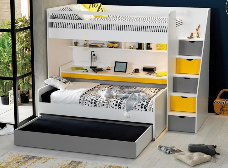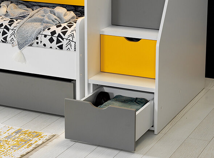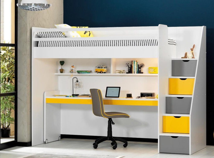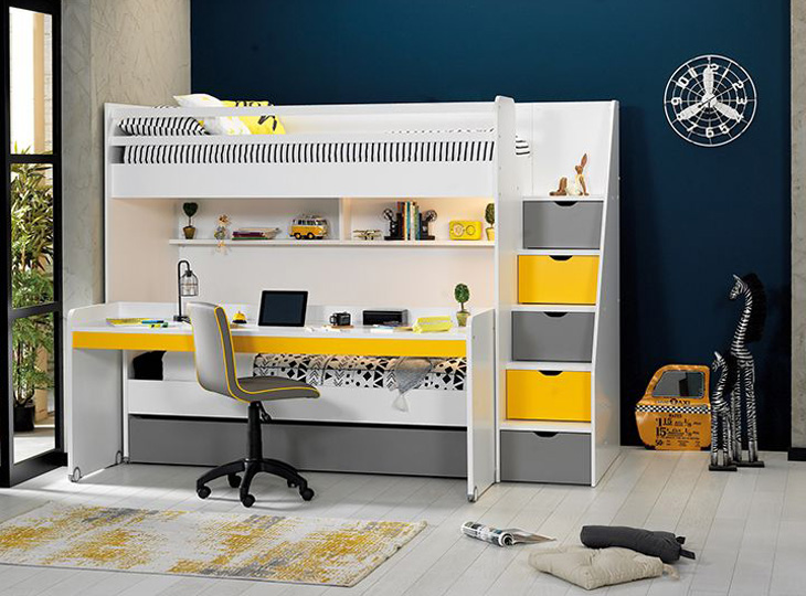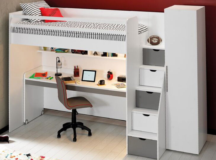 Basisbed Neo met trapkast en bureau is een hoogslaper waar standaard een trapkast en bodemplaat bij geleverd word. Dit bed kan helemaal naar eigen wens samen gesteld worden. Zo kunnen er verschillende maten bureaus, kasten of een bed met slaaplade aan toegevoegd worden. Deze hoogslaper is dus super veelzijdig! De trap functioneert niet alleen als trap maar ook als extra opbergruimte dankzij de vijf opbergvakken (4 kastjes en één lade) en kan zowel links als rechts gemonteerd worden. Verder bevindt zich onder de hoogslaper een tweedelige plank, een LED-strip en een USB-aansluiting.