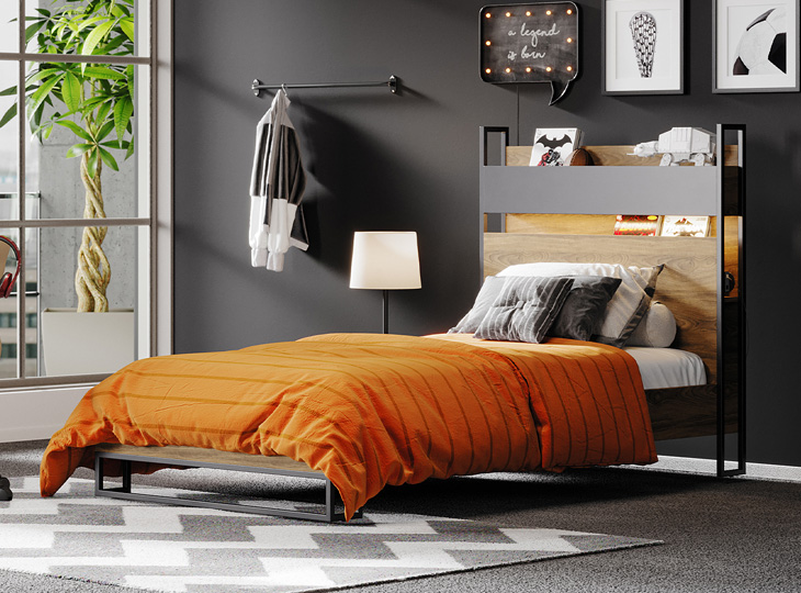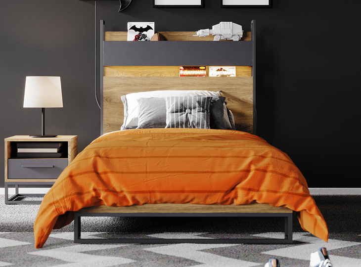 Het New Legend bed 120/200, vervaardigd van melamine houtvezelplaat met een afwerking in de kleuren grijs en walnoot, is een absolute eyecatcher voor de kinderkamer en/of tienerkamer. Het bed straalt stijl uit met het antraciet metalen frame, wat een stoere industriële look toevoegt. Het opvallende hoofdbord bevat handige opbergvakken om je favoriete spullen in op te bergen. Met het one-touch lampje kun je deze mooie spullen met één druk op de knop verlichten. Een geweldige combinatie van functionaliteit en stijl! Het bed is er ook in een standaardmaat van 90/200.