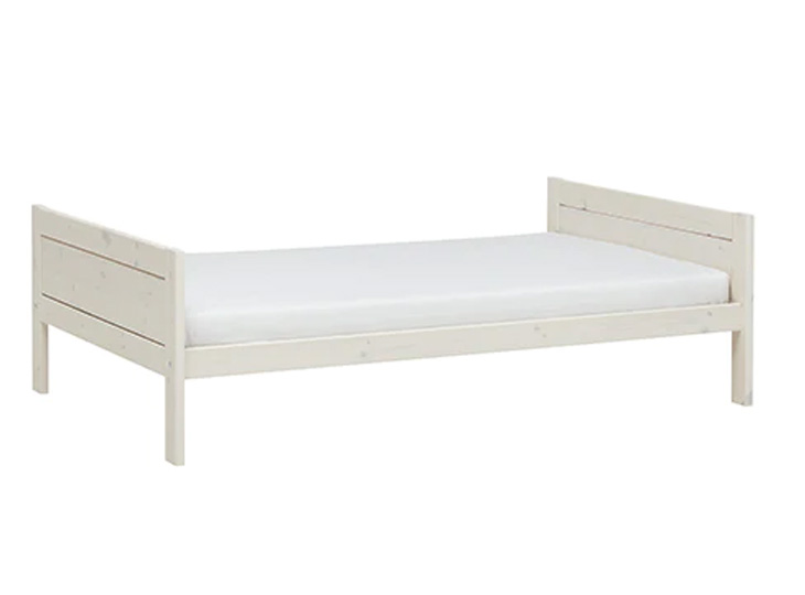 Dit eenpersoonsbed is een geweldig basic tienerbed. Dit eenpersoonsbed heeft in tegenstelling tot het basisbed geen achterzijde. Zo plaats je het bed gemakkelijk in het midden van de kamer, met het hoofdeinde tegen de muur. Voor onze witgekalkte kinderbedden gebruiken we massief grenenhout met knoesten voor alle delen van het bed. Dit versterkt de natuurlijke uitstraling van het meubel en het houten patroon waardoor er licht door de lak schijnt. Het oppervlak van het hout is behandeld met lak op waterbasis. Deze bevat minder witte pigmenten dan de witte lak, waardoor de natuurlijke uitstraling ontstaat.