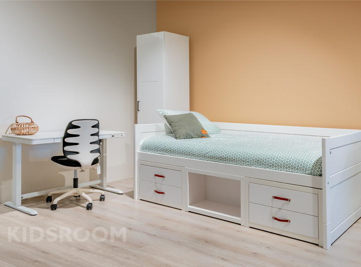 Soms heb je gewoon een kamer nodig voor alles. Het perfecte bed voor spelen, opbergen, logeerpartijtjes en gezellige momenten. Wanneer je kind wat ouder is en meer opbergruimte nodig heeft of slaapfeestjes met vriendjes of vriendinnetjes wil houden, heeft dit 120x200 kajuitbed een fijne hoogte. Voor dit bed zijn verschillende extra opties beschikbaar: