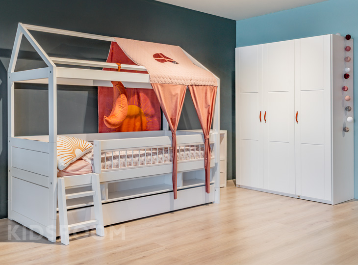 Lifetime Kajuitbed met Dakframe, Opbergruimte en Bedlade. Dit fantastische kajuitbed is een klein beetje hoger dan ons standaard kinderbed, dit geeft een handige ruimte onder het bed. Het kajuitbed is uitgevoerd met een extra bedlade (waar evt. in combinatie met een lattenbodem een matras in kan) en een opbergbox om spulletjes in op te bergen. Door het dakframe creeër je een gezellige en geborgen ruimte. Deze kan bekleed worden met een dakstof, houten dak of een leuke light string!