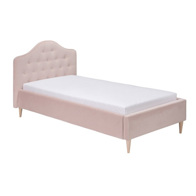 Dit luxe gestoffeerde kidsdepot bed is voorzien van een prachtige velours oud roze stof en heeft een stijlvol gecapitonneerd hoofdbord dat elke slaapkamer een elegante uitstraling geeft. De pootjes zijn gespoten in een subtiele goud kleur.