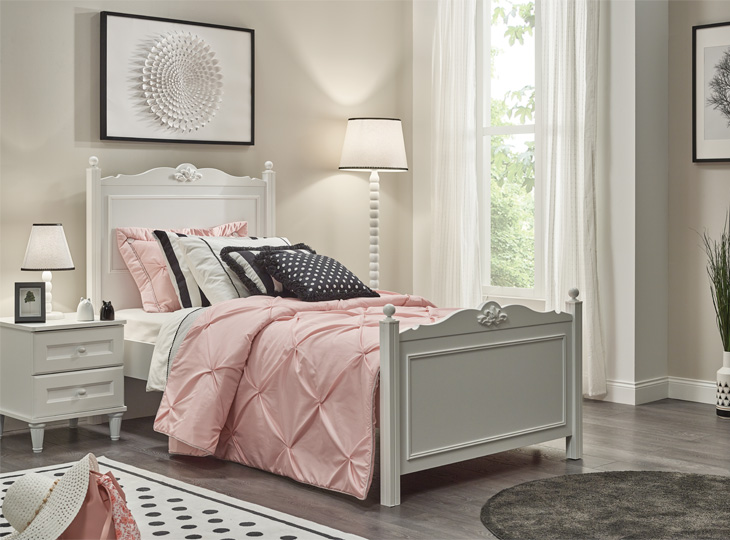 Meisjes bed Lora is hét bed voor de meiden die als prinses in bed willen slapen. Dit witte meisjes bed is 90x200 cm en heeft sierlijke elementen op het hoofd- en voetenbord. Bij dit Lora meisjes bed is ook een complete slaapkamer leverbaar met verschillende kasten, bureau en meer.