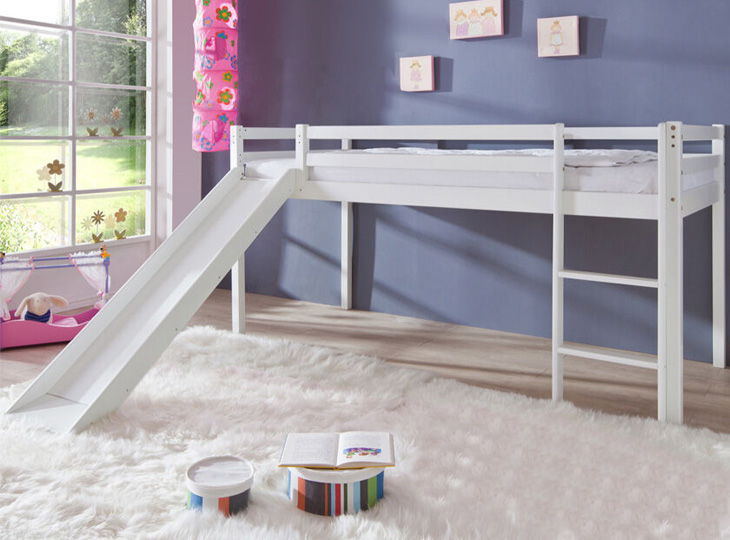 Stevige halfhoogslaper met glijbaan. Uitgevoerd in massief wit gelakt beuken. Blijvend wit, verkleurt nauwelijks en heeft geen noesten die zichtbaar kunnen worden.De constructie bestaat uit een stevig massief frame van 60x60 mm en massieve zijden. Hierdoor is deze halfhoogslaper ontzettend stabiel en heel erg sterk.
