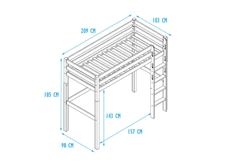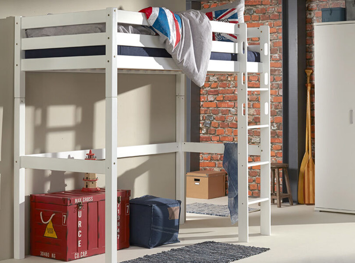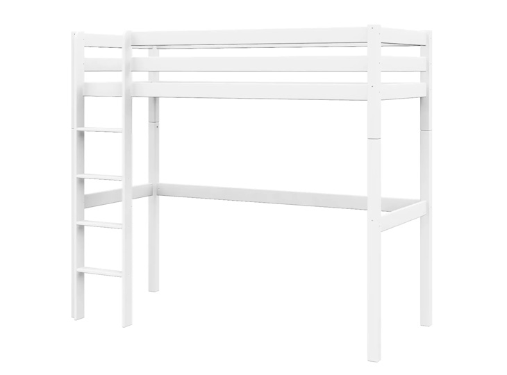 De hoogslaper is uitgevoerd in massief beuken. Deze harde houtsoort is dekkend mat wit gelakt, en minder kwetsbaar dan naaldhout. Ook zal deze houtsoort niet verkleuren. Dit hoge bed is ruimtebesparend, zo past er gemakkelijk een bed of slaapbank onder het bed. Hierdoor maak je optimaal gebruik van de ruimte.