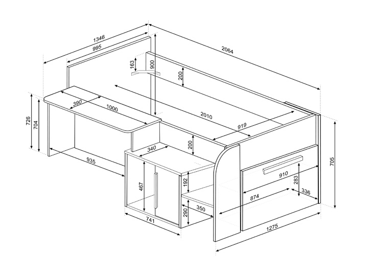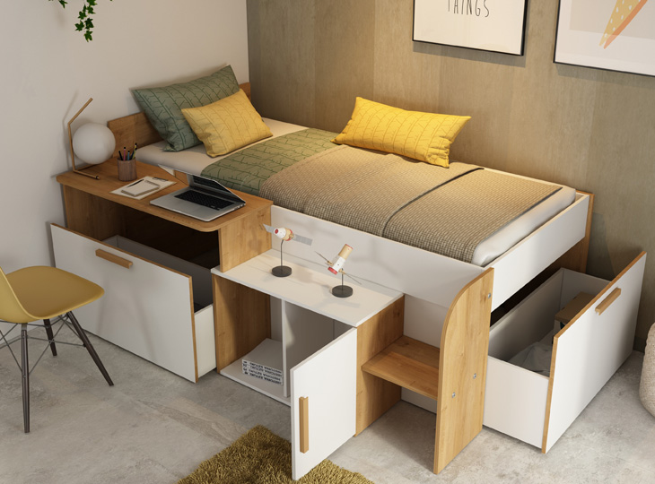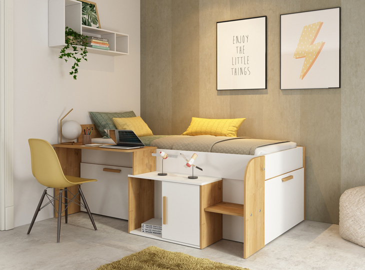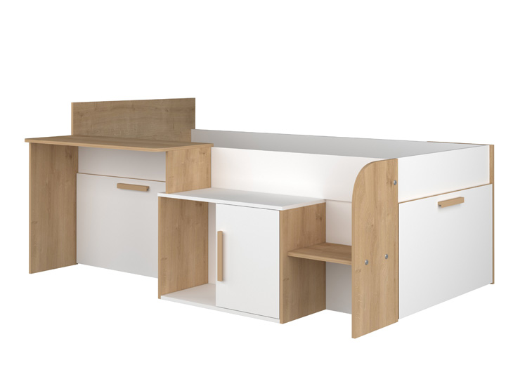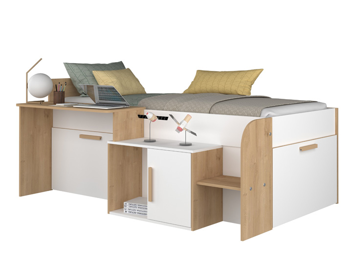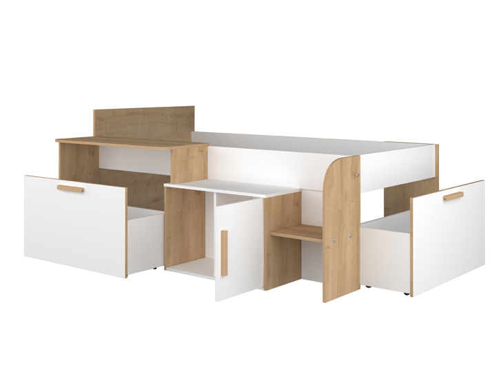 Sla twee vliegen in één klap met kinderbed Sacha! Dankzij zijn slimme ontwerp slaap je als nooit tevoren en maximaliseer je tegelijkertijd de beschikbare ruimte in de kamer. Met zijn ingebouwde bureau is dit het perfecte bed voor wat kleinere slaapkamers.