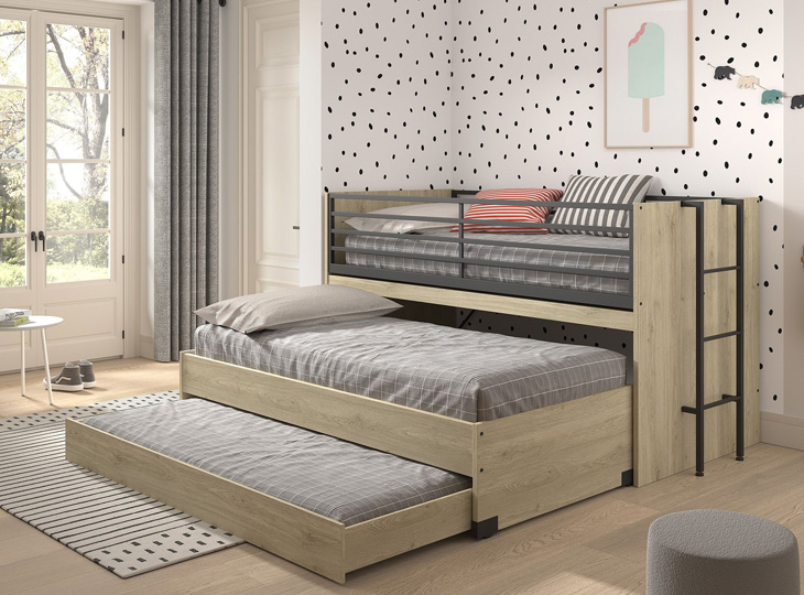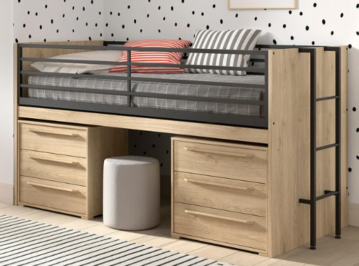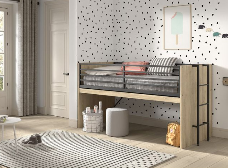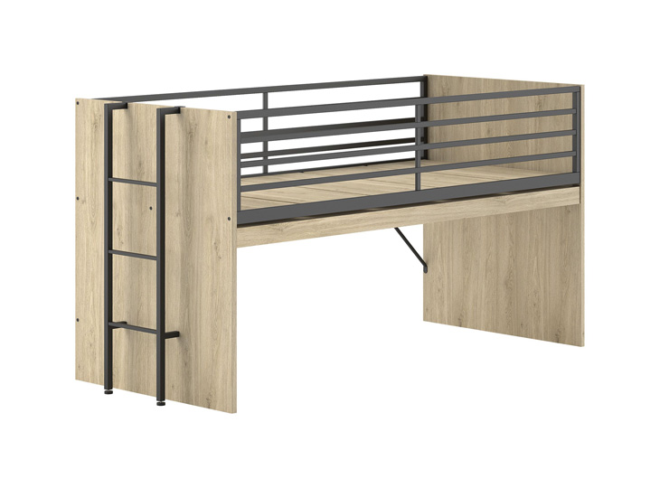 Deze hoogslaper (90 x 200 cm) uit de SAM-collectie combineert trendy eikendecor met zwarte metalen accenten voor een eigentijdse en stijlvolle uitstraling.
