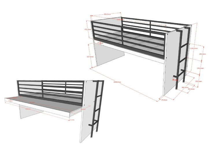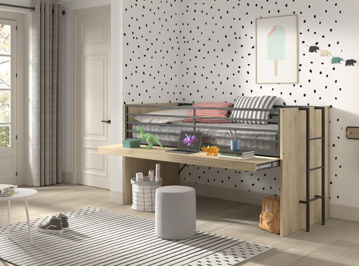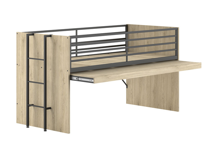 De hoogslaper is ontworpen met oog voor detail en gebruiksgemak. Zo beschikt het bed over een uitschuifbaar bureau met een ruim werkoppervlak — perfect voor huiswerk, creatieve projecten of computerwerk. De stevige ladder kan zowel links als rechts worden gemonteerd, en een uitvalbeveiliging zorgt voor extra veiligheid tijdens het slapen.
