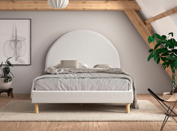 Bestel de leuke Moon poef met witte bouclé stof bij dit bed! Dit is  niet alleen handig om naast uw bed te zetten, maar kan ook elders in de slaapkamer als poef, bijzettafeltje of voetenbankje worden gebruikt.