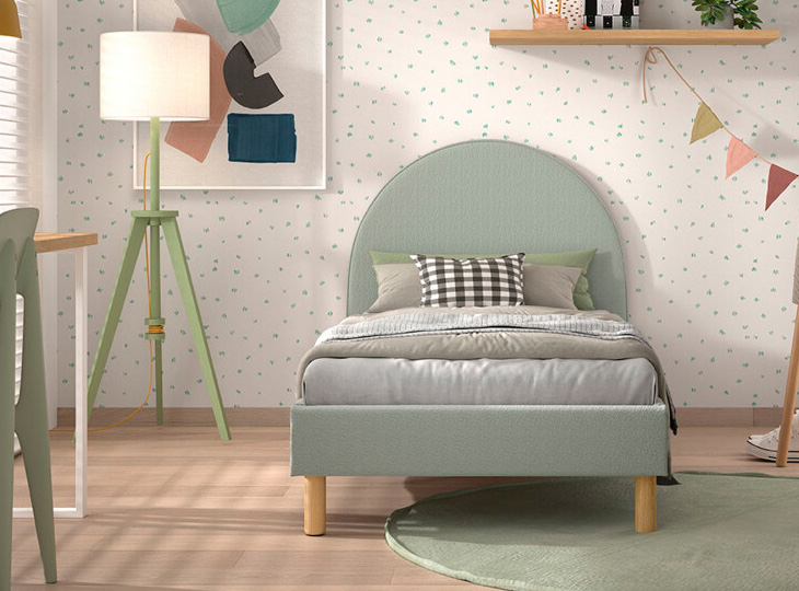 Bestel de leuke Moon poef met groene bouclé stof bij dit bed! Dit is  niet alleen handig om naast uw bed te zetten, maar kan ook elders in de slaapkamer als poef, bijzettafeltje of voetenbankje worden gebruikt.