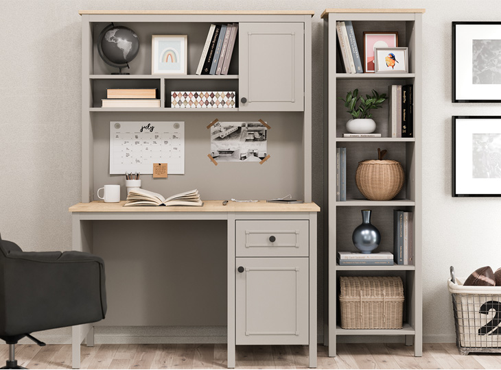 Dit stijlvolle en stevige bureau, uitgevoerd in de neutrale kleuren grijs en lichteiken, is gemakkelijk te combineren. Het is verkrijgbaar in twee formaten. Bovendien heeft u de keuze om het bureau uit te breiden met een handig opzetgedeelte.