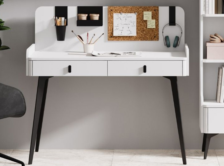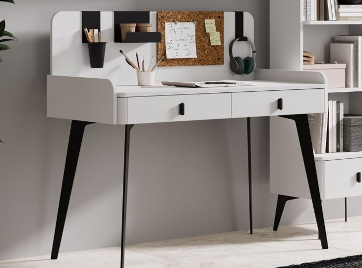 Een trendy en tegelijkertijd stoer tienerbureau! Dit leuke bureau is uitgevoerd in neutraal wit met een zwart, metalen frame. Het heeft leuke details en is voorzien van twee handige lades onder het bureaublad.