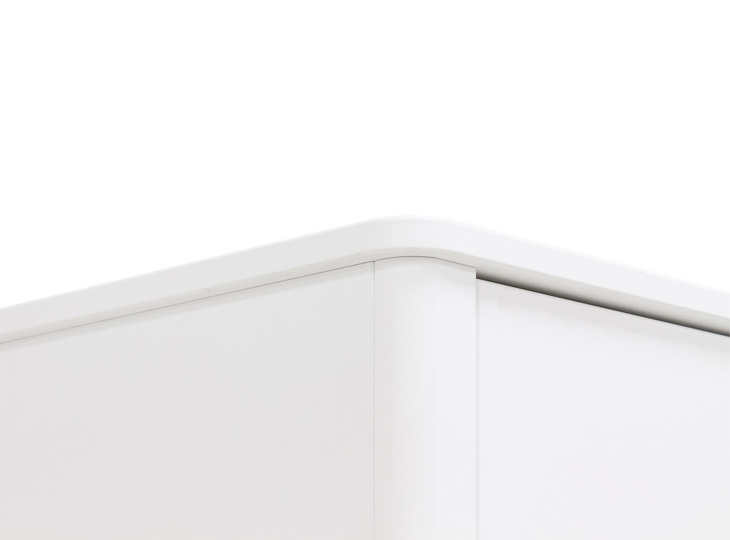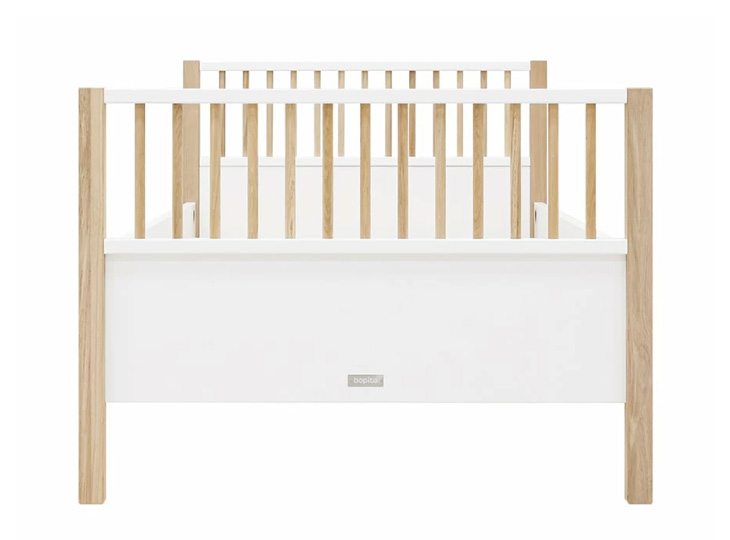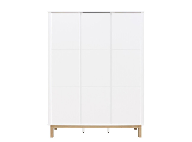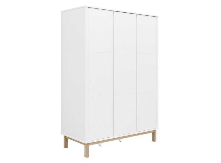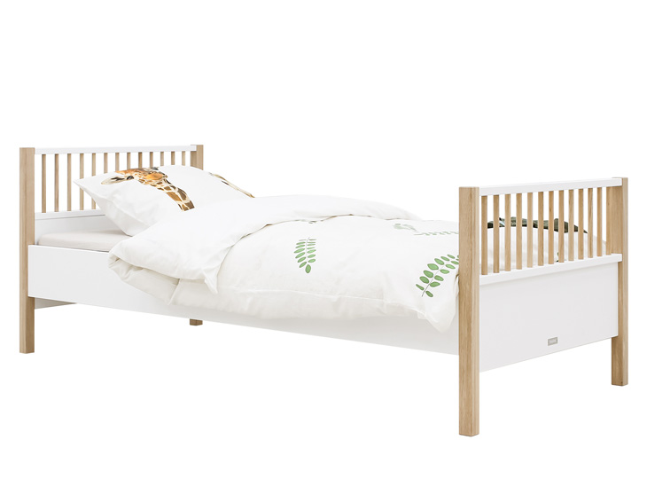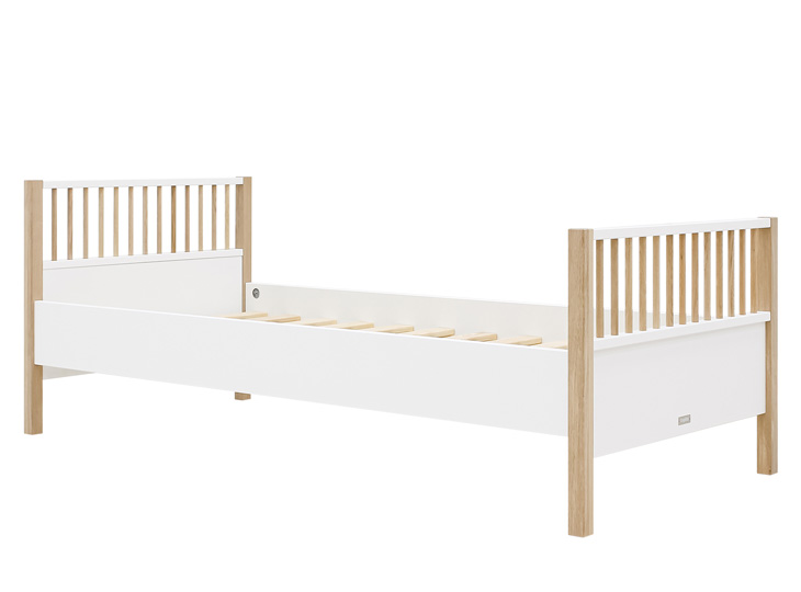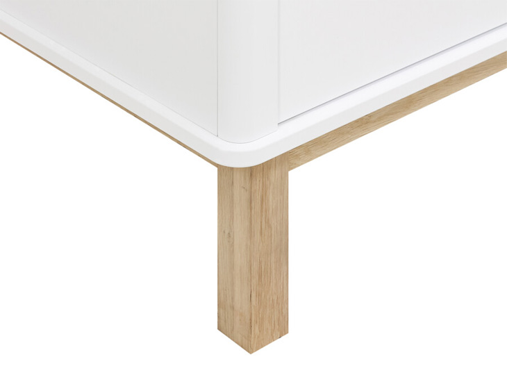 Het bed Mika is uitgevoerd in een speelse combinatie van mat afgewerkt eiken en wit gelakt MDF. De kast staat op een mat afgewerkt eiken onderstel. De greeploze deuren zijn voorzien van subtiele horizontale groeven. Het interieur bestaat uit drie vaste legplanken, twee hangroedes en zeven in hoogte verstelbare legplanken. Genoeg plek dus om kleding in op te bergen. De afgeronde hoeken van deze kledingkast Mika, zorgen voor een luxe uitstraling!
