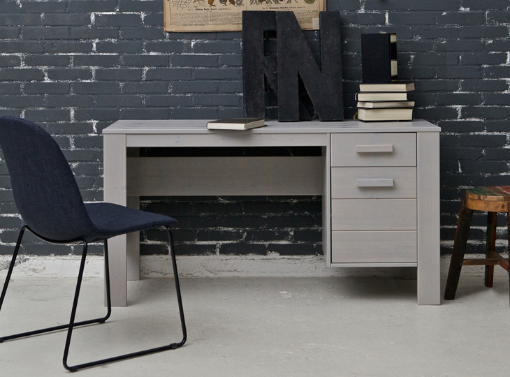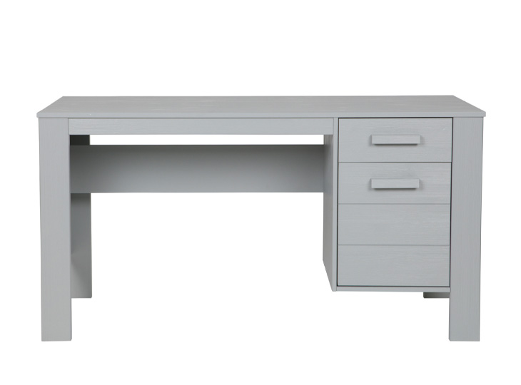 Het bureau van Woood |  Dennis is gemaakt van grenenhout en afgelakt in beton grijs. Dit bureau heeft 1 lade met een handgreep aan de rechterkant, en een kastje met 1 deur. Gemaakt van geborsteld hout. De nerven en noesten worden door het borstelen geaccentueerd waardoor het hout van de Woood Dennis bureau een doorleefde uitstraling krijgt. Combineer dit bureau met  kinderkamer Dennis