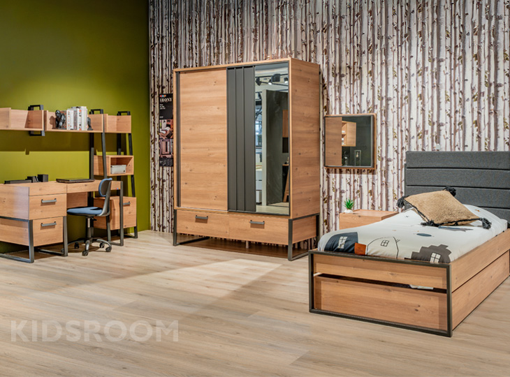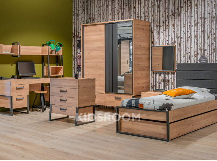 Kinder-/tienerkamer Irony, nu in een 3-delige set. Robuuste kamer in een stoere industriële look. Het stoere materiaalgebruik van de Irony en de eigentijdse vormen geven deze kinderkamer een moderne uitstraling.