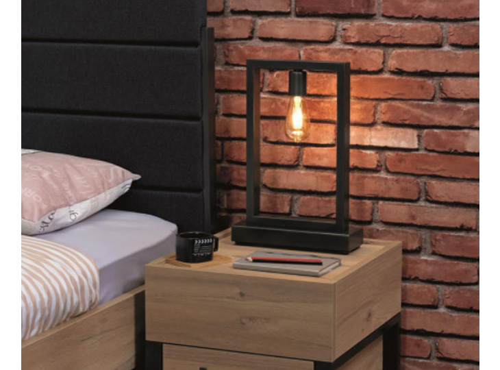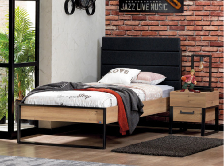 Irony is gemaakt van melamine houtvezelplaat in blank eikenkleur, gecombineerd met antraciet gelakt metaal. U heeft de keuze uit 2 type bedden, met recht hoofdbord, of met een schuin hoofdbord (zie foto's). Dit hoofdbord is gestoffeerd in antracietgrijze denim. Het bed wordt geleverd exclusief lattenbodem en matras.