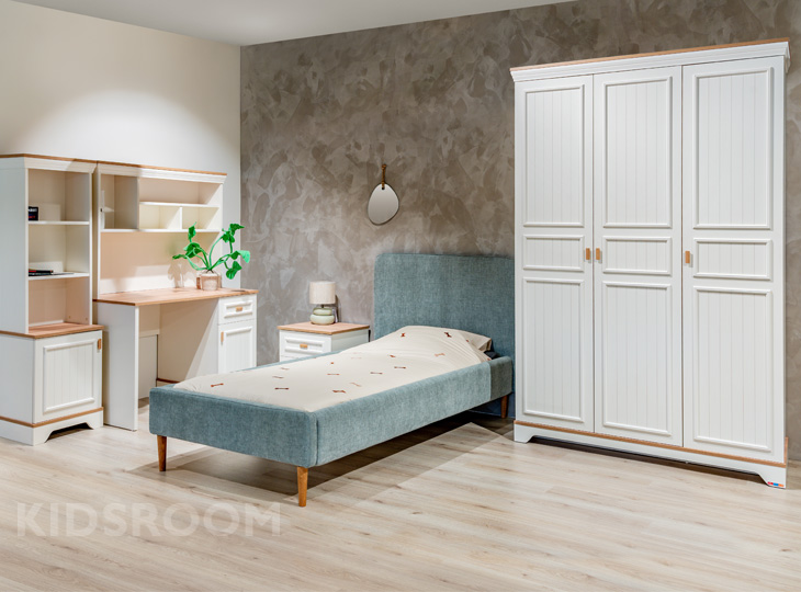 Kinder-/tienerkamer Juna/Monte, nu in een 3-delige set! Met een tijdloos gestoffeerd bed (90×200) in stof en kleur naar keuze. Deze kamer komt met een prachtig nachtkastje in gebroken wit met blank eiken bovenblad waarvan de twee laden soepel schuiven op metalen geleiders en een ‘soft-close’ systeem hebben. En een kledingkast met 3 deuren, deze bevat achter de linker- en middendeur 2 legplanken en 2 kledingroedes, waarvan 1 met LED verlichting. Achter de rechterdeur 5 legplanken. Deze kamer is perfect geschikt voor jongens en meisjes.