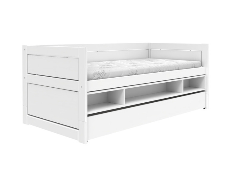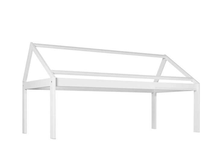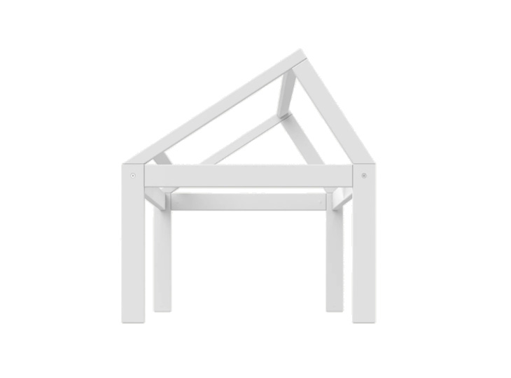 Dit iets hogere kajuitbed biedt ruimte voor verschillende combinaties onder het bed: een opbergbox met bedlade, een logeerbed met bedlade, drie boekenkasten of een climb & slide-module. Het dakframe creëert een knusse, geborgen sfeer en is te bekleden met dakstof, houten dak of lichtsnoer. Op de foto zie je dakstof Sunset Dreams. Optioneel: laddertje voor makkelijke instap.
