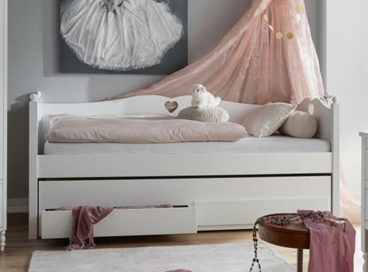 Kinder-/tienerkamer Emma, nu in een 2-delige set! Met een bedbank waaronder een slaap/opbergcombinatie zit. Een sierlijke 2-Deurskast met lade die soepel schuift op metalen geleiders. De kast heeft 3 ruime legplanken en een hangroede. Deze kamer is perfect geschikt voor een mooie prinsessenkamer. De sierlijke afwerking en de gefreesde hartjes maken deze meisjeskamer helemaal af.