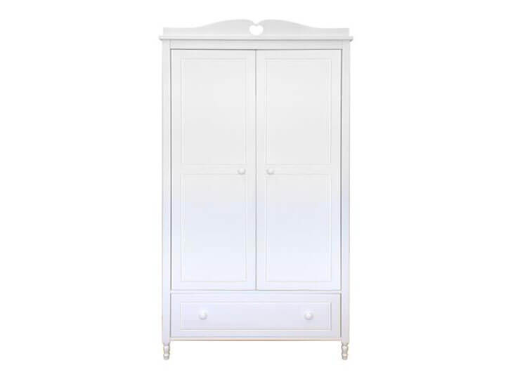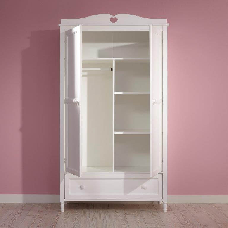 Kast Emma is een super stevige en elegante kledingkast gemaakt van MDF gecombineerd met massief Europees beukenhout. De kast wordt gemaakt in Europa, de afwerking is mooi strak en het geheel is geverfd met kindvriendelijk lak. De kinderkast Emma is lekker ruim en heeft zowel een hang als leg-gedeelte met verstelbare planken. Daarnaast heeft het een ruime lade op metalen geleiders. Kenmerkend voor de Emma serie is natuurlijk het mooie hartje dat in het opzet stuk zit. Het opzetstuk met hartje is ook gemakkelijk te demonteren als hartjes niet meer hip zijn. Met de 2 deurs kast Emma haal je een hoge kwaliteitsproduct in huis waar je jaren plezier van zult hebben. De kledingkast Emma mag natuurlijk niet ontbreken in een echte prinsessenkamer.