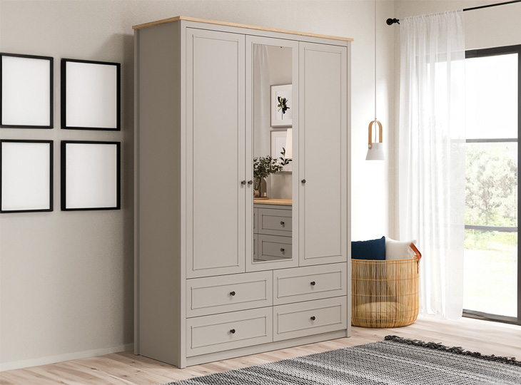 De Sento 3-deurs Kledingkast met Spiegel combineert stijl en functionaliteit in één indrukwekkend meubelstuk. Uitgevoerd in een moderne grijze tint en voorzien van een centrale spiegel, biedt deze kast een ruime opbergoplossing voor elke slaapkamer. Met vier lades aan de onderkant, legplanken en een kledingroede, is deze kast ontworpen om al je kleding en accessoires netjes en georganiseerd te houden.
