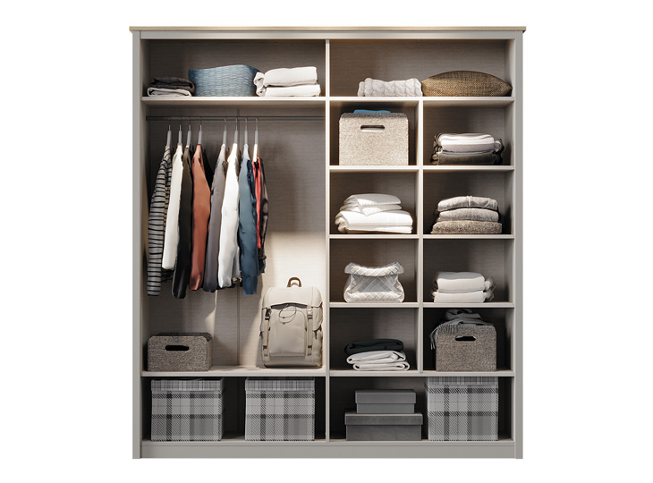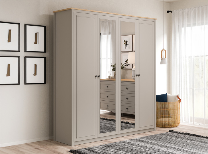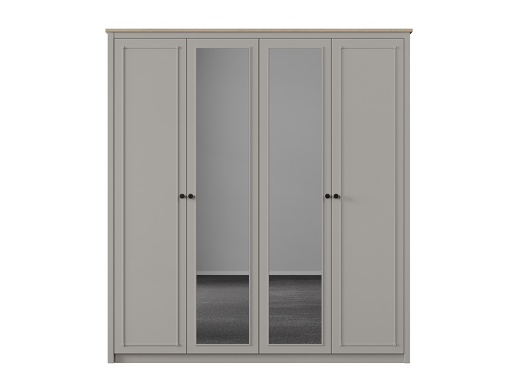 De Sento 4-deurs Kledingkast met Spiegels is de ultieme opbergoplossing voor wie stijl en functionaliteit wil combineren. Met een moderne grijze afwerking en twee grote spiegels in het midden, voegt deze kast een gevoel van ruimte en luxe toe aan elke slaapkamer. De kast biedt een uitgebreide indeling met zowel ruime legplanken als kledingroedes, zodat al je kleding en accessoires netjes kunnen worden opgeborgen. Aan de linkerkant bevinden zich twee grote legplanken en een kledingroede, ideaal voor het ophangen van overhemden, jassen en jurken. Aan de rechterkant vind je een grote legplank, met daaronder twee rijen van vier smalle legplanken, perfect voor het opbergen van gevouwen kleding, schoenen of accessoires. De spiegels in het midden van de kast bieden niet alleen een praktische functie, maar voegen ook een stijlvol element toe aan het ontwerp.