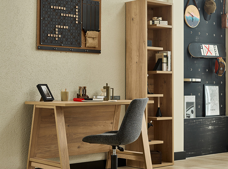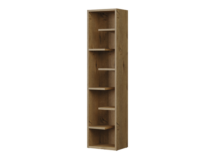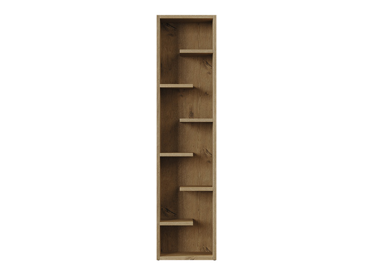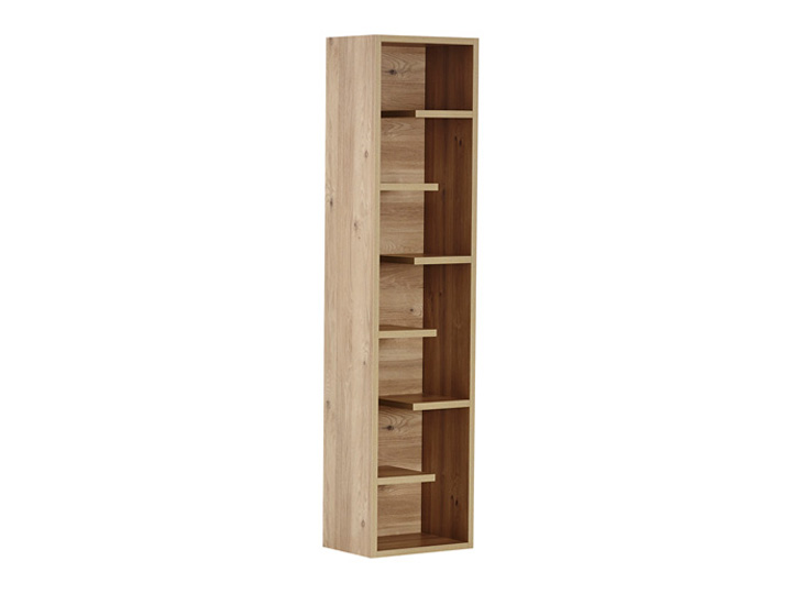 Slanke boekenkast, gemaakt van hoogwaardige meubelspaanplaat met een melamine afwerking in blank eikenkleur.