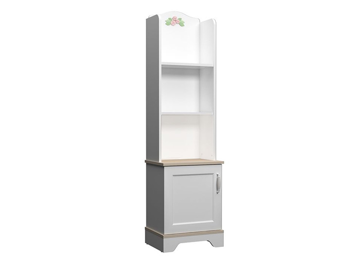 Achter het deurtje bevinden zich twee opbergvakken. Verder is boven aan de boekenkast een mooi bloemdetail te vinden.