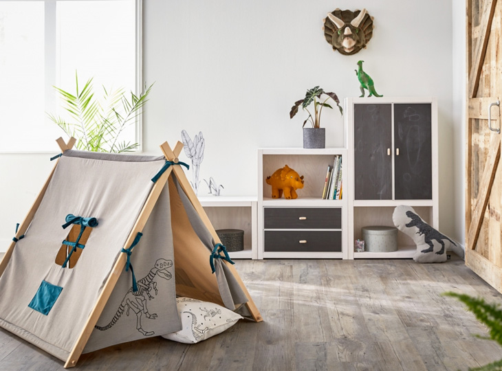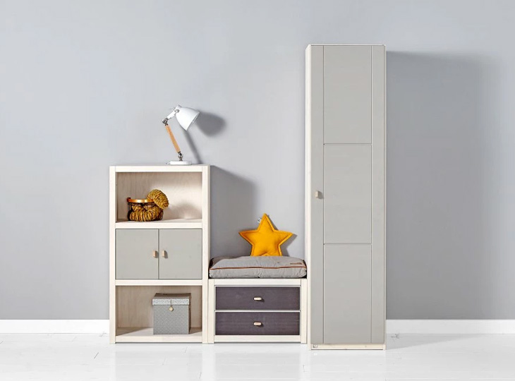Deze boekenkast voor de kinderkamer kan worden gecombineerd met verschillende onderdelen van