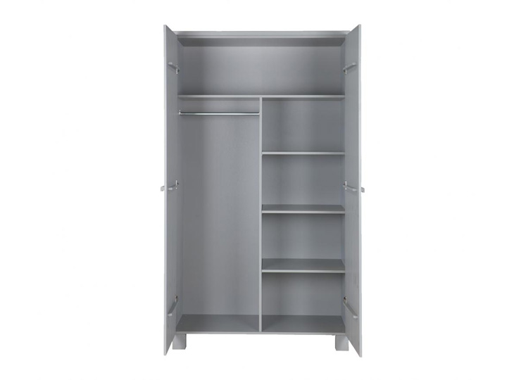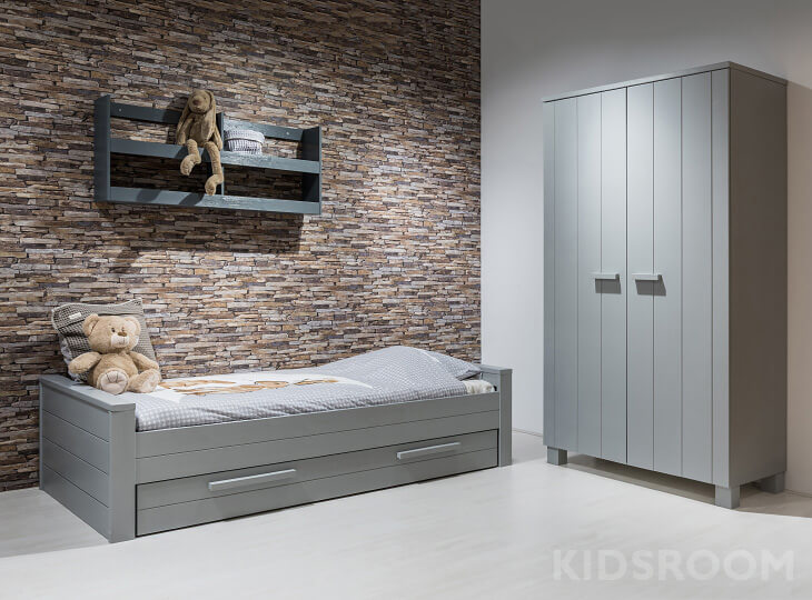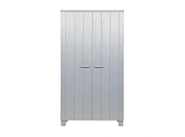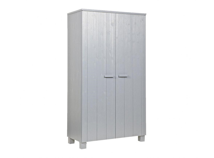 Deze Woood 2-deurs kledingkast Dennis past perfect in een moderne slaapkamer. Deze houten kast op pootjes is gelakt in een betongrijze kleur, heeft een geborstelde afwerking en de deuren hebben een verticale v-groef belijning. De kinderkast heeft een legplank over de breedte van de kast, het linker deel van de kast is een hanggedeelte en het leggedeelte met 5 legplanken zit rechts. Genoeg ruimte om al je kleren op te bergen. Alle delen van de kast die je ziet, zijn gemaakt van gelakt grenen. De legplanken en de achterkant bestaan uit spaanplaat. De nerven en noesten in het hout blijven zichtbaar wat de kast een extra robuust karakter geeft en is ieder exemplaar uniek.