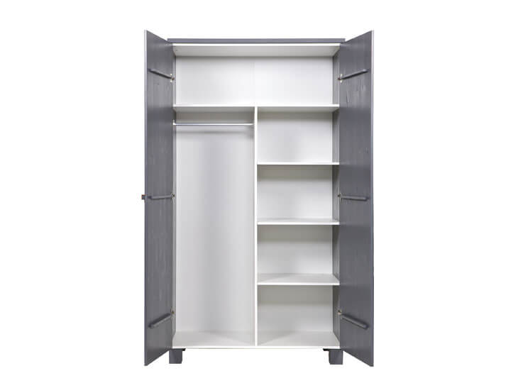 Deze Woood 2-deurs kinderkledingkast Dennis past perfect in een moderne slaapkamer. Deze houten kast op pootjes is gelakt in een staal grijze kleur, heeft een geborstelde afwerking en de deuren hebben een verticale v-groef belijning. De kinderkast heeft een legplank over de breedte van de kast, het linker deel van de kast is een hanggedeelte en het leggedeelte met 5 legplanken zit rechts. Genoeg ruimte om al je kleren op te bergen. Alle delen van de kast die je ziet, zijn gemaakt van gelakt grenen. De legplanken en de achterkant bestaan uit spaanplaat. De nerven en noesten in het hout blijven zichtbaar wat de kast een extra robuust karakter geeft en is ieder exemplaar uniek.